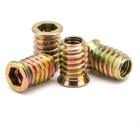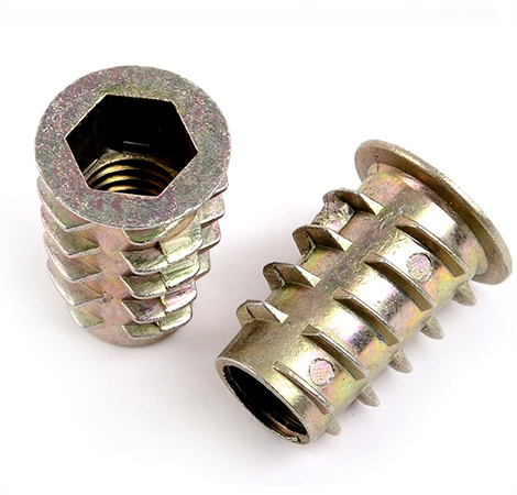 The distinctive exterior thread of the D Nuts for Wood ensures secure locking and provides excellent resistance to pull-out caused by tensile, vibration, or torsion loads. The flange's head keeps covered surfaces from separating, and the D nut is driven too far.
